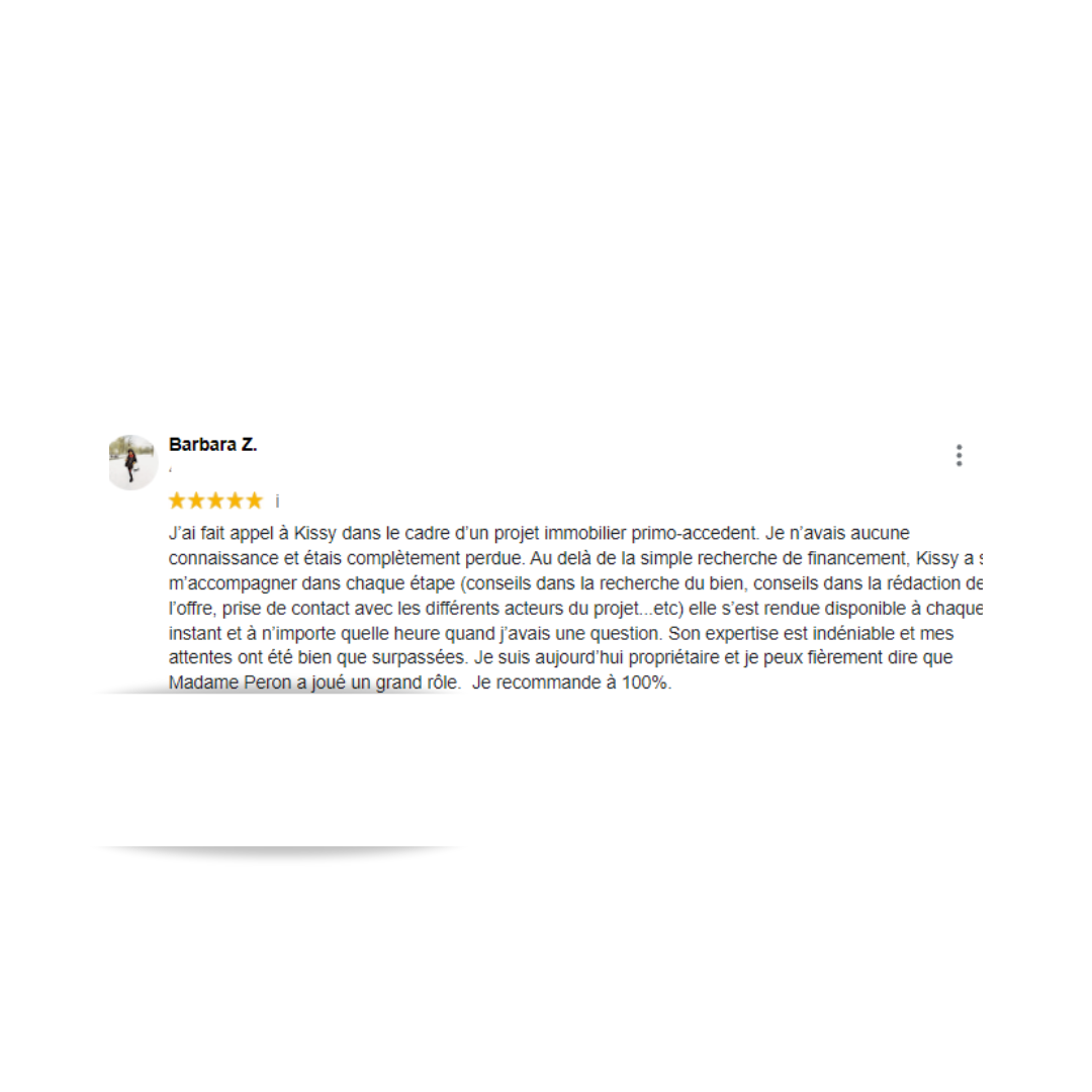 Madame PERON nous a permis de réaliser notre rêve immobilier plus rapidement que prévu. Elle est experte et très professionnelle dans le domaine du crédit et donne les meilleurs conseils pour réussir un projet immobilier. Je la recommande à 100% et sans hésitation.